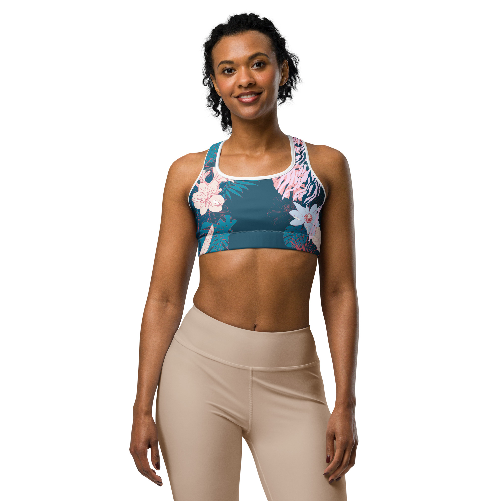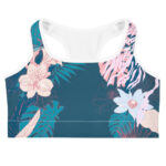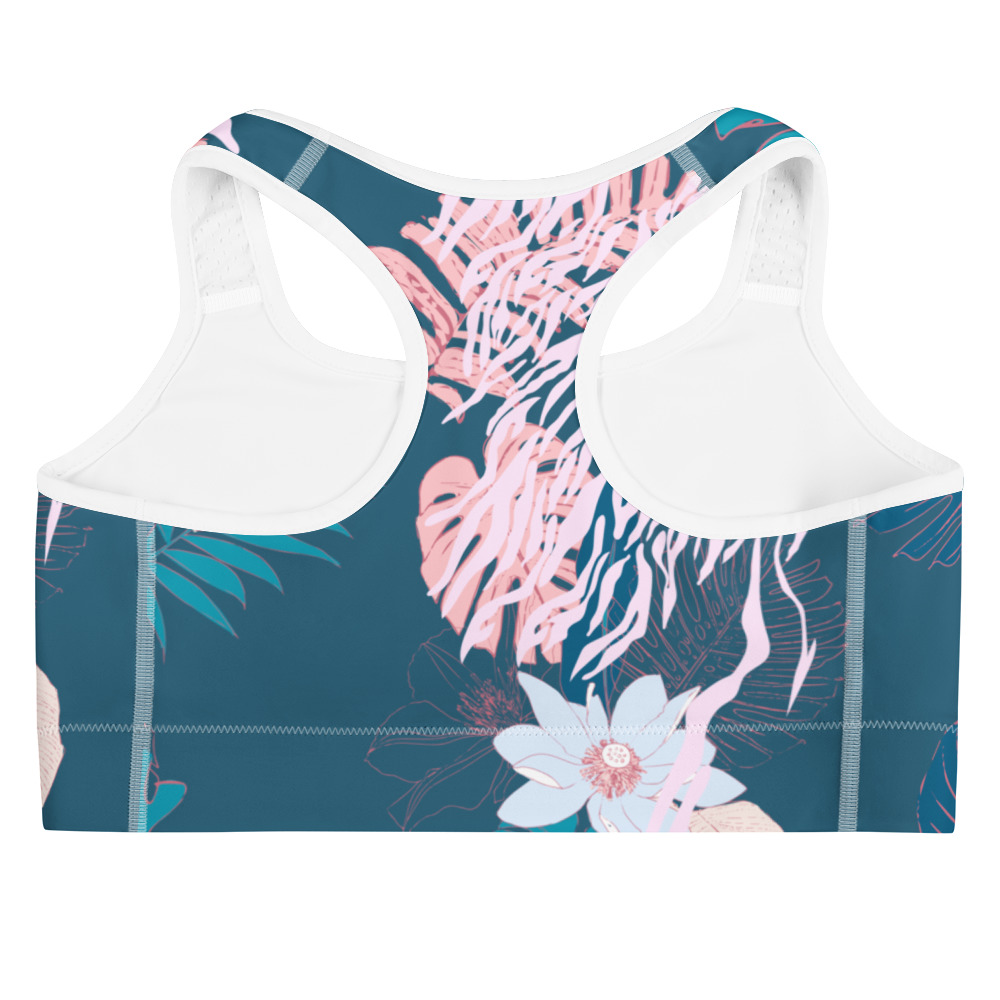 Flow into tropical ease. This floral sports bra brings island calm with a moody teal backdrop, delicate blush botanicals, and soft pastel contrast. Whether you’re stretching, strolling, or soaking up the sun, its comfy racerback and secure support let you move freely and feel grounded.
