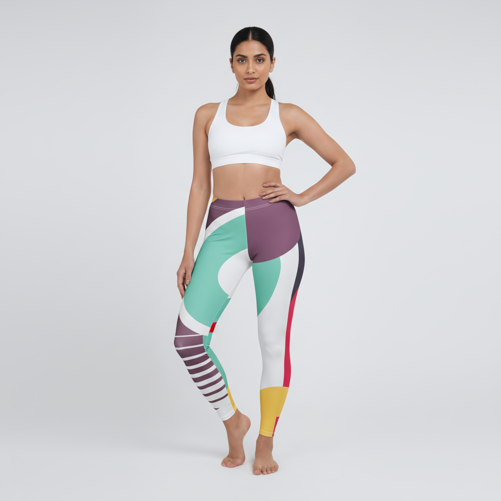 Play with contrast. These leggings blend curved motion and linear rhythm in a palette of mint, plum, and gold with clean graphic hits. Made-to-order for the bold and the balanced, they’re a flexible fit for every stretch, sprint, or slowdown.
